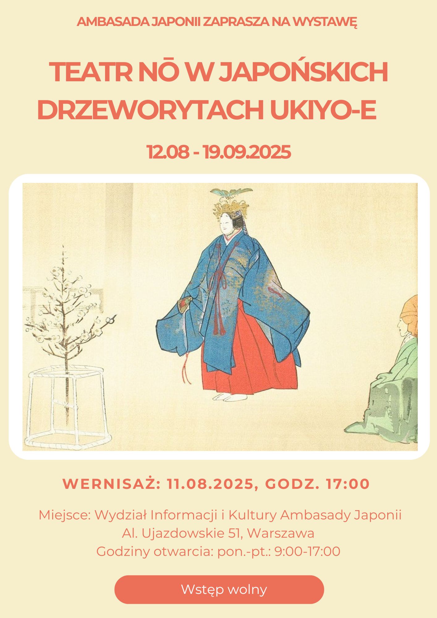Na wystawie prezentowany jest wybór trzydziestu drzeworytów Tsukioka Kōgyo – pochodzących z cyklu Nōga taikan, wydanych przez Seibi Shoin w 1936 roku. Tsukioka Kōgyo (1869–1927), uczeń słynnego Yoshitoshiego i kontynuator tradycji szkoły ukiyo-e w okresach Meiji i Taishō, zapisał się w historii sztuki japońskiej jako jeden z najwybitniejszych ilustratorów teatru Nō. Jego monumentalne dzieło, „Nōga taikan” (Wielka ilustrowana encyklopedia Nō), tworzone w latach 1925–1930, choć częściowo ukończone już po jego śmierci, obejmuje ponad dwieście barwnych drzeworytów.